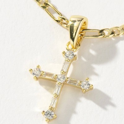 The Cross And Chain Necklace brings the gold and the glam to any look. Featuring a gold figaro chain and an extra glamorous cross, this pendant and chain necklace is made to be worn every day with any look. Trust us, this is the gold cross necklace every jewelry collection needs.