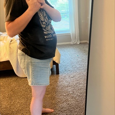 I like that the cuffs aren’t sewn in, so you can unroll the cuffs to make the shorts longer. I wear size 10/12 pre-pregnancy. I’m 17 weeks now and have gained 10lbs so far. I got my normal size 10 in these, and they are very loose. They get even looser as you wear throughout the day. I will buy in another wash, but will size down 1 or 2 sizes.