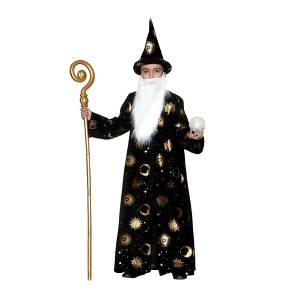 - COSTUME INCLUDES: This costume set includes fully detailed open front robe, hat, and beard. Staff and crystal ball accessories not included.