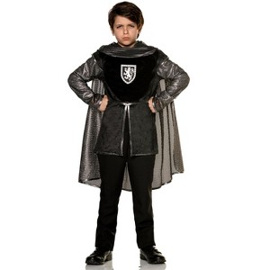 Transform your young adventurer into a valiant hero of the Middle Ages with our Crusader Child Costume, an impressive ensemble that captures the essence of noble knights and epic crusades. This distinguished boys' knight costume features a luxurious black velvet tunic, elegantly trimmed with metallic accents that shimmer with a regal luster, adding an air of grandeur and sophistication. At the heart of the tunic, a silver lion crest patch proudly displays, symbolizing courage, strength, and the noble lineage of a true crusader. The tunic is complemented by realistic chainmail sleeves that not only evoke the protective gear of medieval warriors but also provide a comfortable and authentic look. Adding to the ensemble's authenticity is a matching chainmail collar, which seamlessly integrates with an attached flowing cape. This cape drapes gracefully over the shoulders, enhancing the heroic silhouette and providing a striking contrast to the tunic's rich black hue. The chainmail detailing, both on the sleeves and the collar, is meticulously designed to give the appearance of genuine medieval armor. Perfect for Halloween, historical reenactments, or any occasion where your child wants to embody the spirit of a knight on a noble quest, the Crusader Child Costume is a standout choice that will inspire tales of bravery and honor. With its combination of luxurious fabrics, detailed craftsmanship, and iconic medieval symbolism, this costume allows your child to step into the shoes of a legendary knight, ready to embark on daring adventures and uphold the values of chivalry and justice.