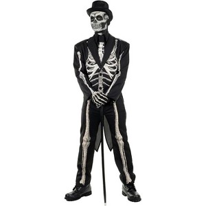 TRANSFORM INTO CHILLING CHARACTERS: Plunge headlong into the world of your favorite eerie movies, TV shows, and video games by bringing their spine-chilling characters to life through our diverse range of costumes. FRIGHTEN AND DELIGHT TRICK-OR-TREATERS: Make trick-or-treating unforgettable for the neighborhood kids with costumes that add a dash of delightful dread to their sweet-treat-filled evening. A striking costume perfect for any slightly-skewed formal event goth gathering or Halloween event. You will be the best-dressed man at the blood sacrifice! Screen-printed skeletal design tuxedo jacket with tails faux shirt front with tie pants, gloves