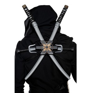 This set is a must-have accessory to add to your cool ninja costume this Halloween! The Ninja Sword Sheath Backpack Set features a sheath that holds 2 ninja swords, 2 ninja sais, and 1 ninja star so you are ready for action! The sheath has attached shoulder straps to keep it securely fastened to your back. All made of safe plastic but with a realistic look. Measures approximately 28" tall.