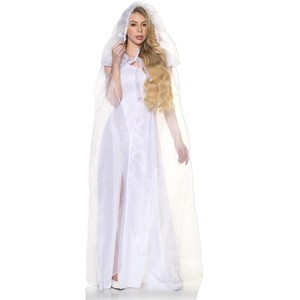 Elevate your costume game with the enchanting Adult Hooded Tulle Cape in pristine white, a versatile accessory that can transform any look into something truly magical. This long, flowing cape is crafted from delicate tulle, offering a dreamy, ethereal quality that adds a touch of otherworldly elegance to any ensemble. The extended hood provides an air of mystery and drama, making it the perfect finishing touch for a wide range of costumes. Imagine yourself as a spectral presence at a Halloween party, a ghost gliding silently through the night with the cape's airy fabric trailing behind you. Or perhaps you envision a fairytale bride, stepping into a world of fantasy with the cape's soft, translucent layers creating a veil-like effect that enhances your enchanting allure. Channel your inner princess, draped in the luxurious folds of this cape, commanding attention and admiration at any themed event. Alternatively, embody a serene forest angel, the cape's white tulle reflecting the purity and grace of your character as you move through a woodland setting. The possibilities are endless with this stunning piece, ensuring you can effortlessly create a myriad of captivating looks that leave a lasting impression.