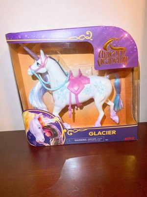 [This review was collected as part of a promotion.] As soon as my child saw the package with Glacier, she was super excited. She has really been into Unicorn Academy lately. The unicorn was a little difficult to free from the packaging, but I got it eventually. The unicorn is fairly large at 11 inches tall. There is a lot of attention to detail. There are beautiful snowflakes on one side of the unicorn. Also the hair of the mane and tail is multicolored and very silky. The bridle and saddle can detach from the unicorn, but it's a little stiff, so my child isn't able to do it herself. Glacier instantly became a favorite toy for my child, she insisted on bringing it on a road trip later that day. The only downside I can think of with this unicorn is that I wish it came with a doll. My child tried to put another doll on it, but it wouldn't fit unfortunately. We will have to be on the lookout for more Unicorn Academy toys in the future. Overall this is a beautiful toy that my child is enjoying and will hopefully continue to play with for years to come