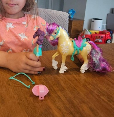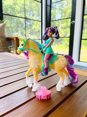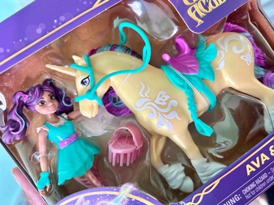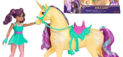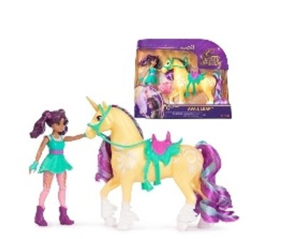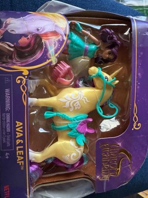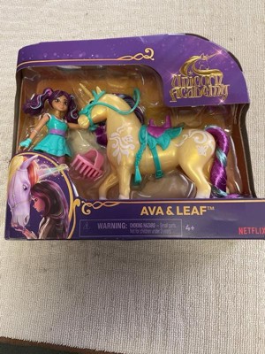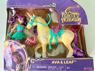 Celebrate the bond between rider and unicorn with the Unicorn Academy Ava & Leaf Set. Inspired by the NETFLIX animated show and best-selling book series where friendship reins, this set will spark endless imaginative storytelling. 4.5-inch Ava features realistic true-to-show details and 7 points of articulation for dynamic poses. Leaf stands at 5 inches tall, complimenting Ava’s look with Plant Magic markings and brushable purple and teal mane and tail (brush included). As you play, pose Ava to sit on Leaf and ride into adventure. With the removable bridle and saddle accessories, Ava can securely stay in place on Leaf. For more ways to experience Unicorn Academy with your favorite characters, look for the other small dolls, including Sophia, Layla, Isabel, Valentina, and their unicorns (sets sold separately) and expand your world. For kids who enjoy unicorns and horse toys, dolls & accessories, doll house play, collectibles, plush toys and more, Unicorn Academy toys are fun birthday gifts for girls or gifts for any occasion. Experience enchanting Unicorn Academy adventures with the Ava & Leaf Set. Includes: 1 Doll, 1 Unicorn, 1 Removable Saddle, 1 Removable Bridle, 1 Hair Styling Tool