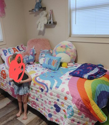 [This review was collected as part of a promotion.] We received our Unicorn Rainbow Queen Quilt Set by Lush Decor and can you say Peace, love, unicorns, and rainbows. Its all there with this bright, bold, and colorful reversible quilt set . The reverse side of this quilt set has a pattern of blue and white stripes .This quilt set includes a soft reversible quilt, matching pillow shams 2 shams for full/queen, and two decorative pillows. The quilt and shams are all machines washable. The decorative pillows should be spot cleaned. But I know one 10 yr old thats never been happier with anything. and loves making up her bed daily..Lots of compliments from her friends and showings of several moms also..We highly recommend Unicorn Rainbow Queen Quilt Set by Lush Decor 5 piece and all their products.
