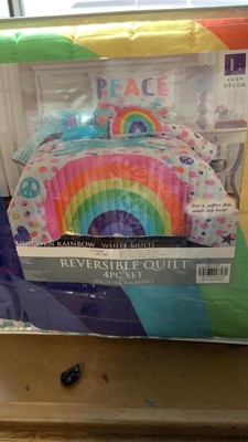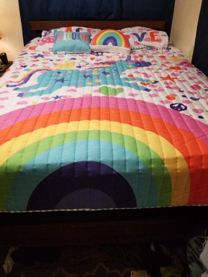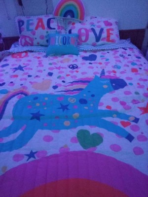 [This review was collected as part of a promotion.] My daughter is delighted with her Lush Decor 5 piece Rainbow Unicorn quilt set. She loves unicorns and rainbows, so this set is perfect for her. The colors are all vibrant, and all the pieces washed up well with no fading or pilling. This set appears to be made with excellent quality, there's no tears or loose stitches to be found. The comforter is so cozy, and the perfect weight. It is also reversible. One side features peace signs, hearts, stars, polk's dots, a rainbow and a unicorn. The other side is blue and white stripes. Both pillowcases are also reversible. With the queen size set we got two pillowcases, one says peace, one says love. Both have blue and white stripes on the reversed side. Also included are two adorable throw pillows, one is reversible, with unicorns written on one side and the blue and white stripes on the other side. The other throw pillow is a brightly colored rainbow. The material on all the pieces is super soft, making this set just as cuddly and comfy and it is cute.