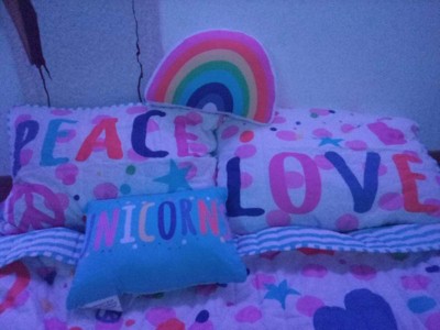 Decorate your childs bedroom with a fun and whimsical design like the Lush Decor Unicorn Rainbow Quilt Set. Bursting with colorful illustrated designs, and text of Peace, Love, Unicorns, and a rainbow, this quilt will spark creativity. The front design also includes hearts, stars and circles to brighten the space and your childs mood. Enjoy two looks in one set! Simply flip over this quilt to reveal a blue and white stripe pattern, easily switching up the look of your kids bedroom decor. The bright colors and exciting print will have your child cheering with delight. This kids bedding set includes 1 quilt, 1 or 2 pillow shams, and 2 decorative pillows. One pillow says "UNICORNS", the other has a rainbow motif. Crafted from a soft microfiber fabric, this kids quilt set offers softness and comfort. The lightweight polyfill filling is perfect for any season, and even makes this a great layering piece. To care for this kids bedding set, simply machine wash cold on the gentle cycle and tumble dry low. Use a steamer to remove wrinkles, if needed. Spot clean the throw pillows.