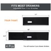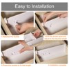 These adjustable drawer dividers are made from durable ABS material and feature foam sponges at the ends to prevent damage to your drawers. They can be expanded from 11 to 18 inches in length and are 3.5 inches high, making them suitable for a variety of organizing needs. Whether used in the kitchen, bedroom, or bathroom, these dividers help bring order to cluttered spaces. Installation is simple: press the top button to adjust the length, extend to secure, and lock in place. To remove, press the button and push the extended side back.