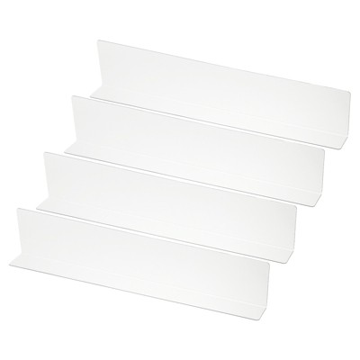 Made of acrylic, it boasts high transparency, resists yellowing, and has a long shelf life. The L-shaped partition design resists tipping or tilting, ensuring neat and aesthetically pleasing storage. The magnetic strip on the bottom easily attaches to metal surfaces for a secure and stable fit. The transparent partition can also be used along the edge of a table to fill the gap between the table and the wall, preventing items from falling. It can be used to store and organize a wide range of items, including beverages, bread, cookies, clothing, and spice bottles. It's suitable for shops, supermarkets, libraries, clubs, and more. Instructions: Easily organize cluttered shelves by snapping items vertically into place with tool-free installation.