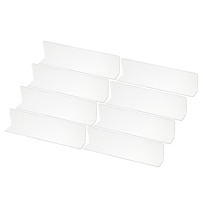 Made of acrylic, it boasts high transparency, resists yellowing, and has a long shelf life. The L-shaped partition design resists tipping or tilting, ensuring neat and aesthetically pleasing storage. The transparent partition can also be used along the edge of a table to fill the gap between the table and the wall, preventing items from falling. It can be used to store and organize a wide range of items, including beverages, bread, cookies, clothing, and spice bottles. It's suitable for shops, supermarkets, libraries, clubs, and more. Instructions: Easily organize cluttered shelves by snapping items vertically into place with tool-free installation.