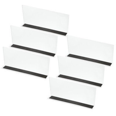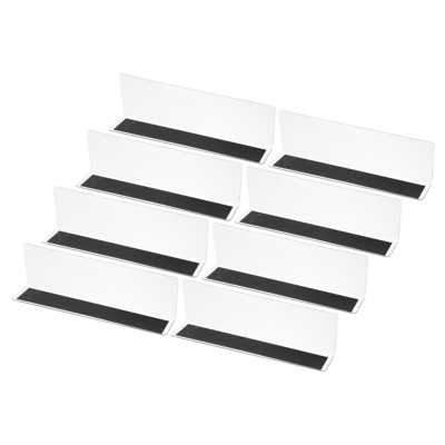Made of acrylic, it boasts high transparency, resists yellowing, and has a long shelf life. The L-shaped partition design resists tipping or tilting, ensuring neat and aesthetically pleasing storage. The transparent partition can also be used along the edge of a table to fill the gap between the table and the wall, preventing items from falling. It can be used to store and organize a wide range of items, including beverages, bread, cookies, clothing, and spice bottles. It's suitable for shops, supermarkets, libraries, clubs, and more. Instructions: Easily organize cluttered shelves by snapping items vertically into place with tool-free installation.