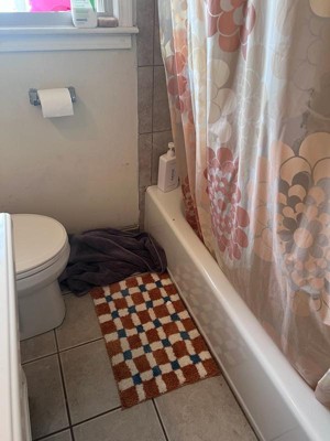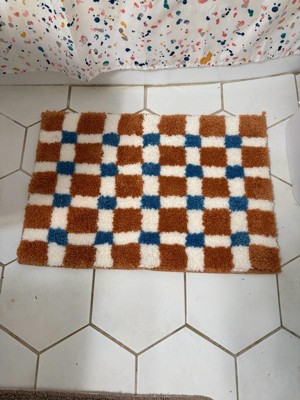 [This review was collected as part of a promotion.] This bath mat is really cute. The checkered design goes well in our minimal decorated bathroom. Its really soft and absorbent. It washes easily.