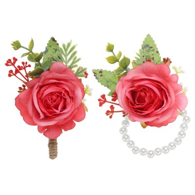Unique Bargains Cloth Flower Lapel Pin with Gold Badge Tassel Chain for Men Wedding 1.57 inch 2 Pcs Red