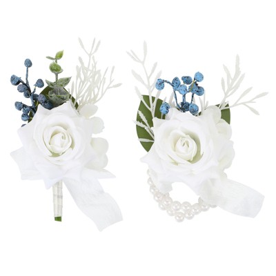 Unique Bargains Cloth Flower Lapel Pin with Gold Badge Tassel Chain for Men Wedding 1.57 inch 2 Pcs White