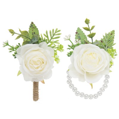 Unique Bargains Fabric Artificial Wedding Rose Flowers Wrist Corsage and Boutonnieres 2 Pcs
