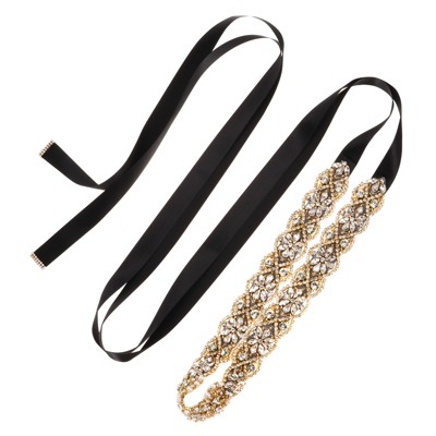Unique Bargains Handmade Rhinestone Wedding Dress Accessories Bridal Belt with Ribbon Gold