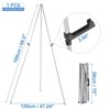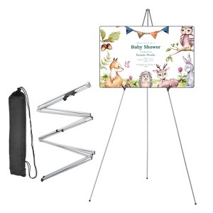This portable easel stand is made of durable iron with a black powder-coated finish, ensuring it is waterproof and rust-proof. It features adjustable height for optimal viewing and a lightweight design for easy transport. The stand is quick to assemble and does not require any tools, making it convenient for users. It is suitable for various applications including weddings, trade shows, and art exhibitions. Its compact design allows for easy storage and transport, making it an ideal choice for those who need to showcase displays at different events. The easel can hold up to 5 pounds, providing stability for various types of signage and artwork.