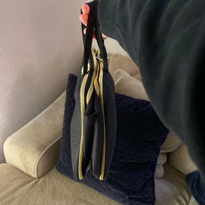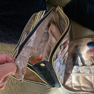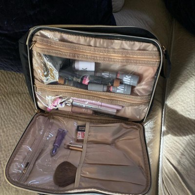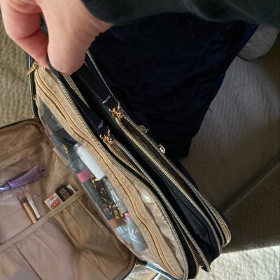 One of the best makeup bags out there. I was searching for a good bag but nothing looked good until I found this one. Products can stand up in the center of the bag, which I love for foundation; that is why I bought it for that feature. Soooo much fits inside and it’s still slim. Super easy zippers, they glide smoothly which was a very nice surprise. There are a TON of pockets and sections, easy to stay organized. The outer material is a soft cloth material and the inside is a different material with plastic for the pockets and covers. The center of the bag has double zippers that has a latch that connects with a snap button, (see pictures.) I’m so happy. I got it on sale for $31 and it was worth it in my opinion but would’ve loved the price at $25. There was a bit of crooked stitching but I don’t mind. Seems to be good quality, even so.