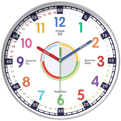 The wall clock is designed with each hour being a different color, with the minutes labeled. The colorful clock face inspires people's interest in learning how to tell time. The learning clock has all the info designed on a colorful face to help people tell time, count minutes or seconds; the minute hand is long enough to point to the minutes, making teaching people to read a clock much more convenient. Quite smooth, continuous-sweep second-hand movement ensures a silent sleeping and work environment. This wall clock is a perfect gift for parents and teachers. The colorful round face is nice room decor for bedroom, classroom, home, school room, or playroom.