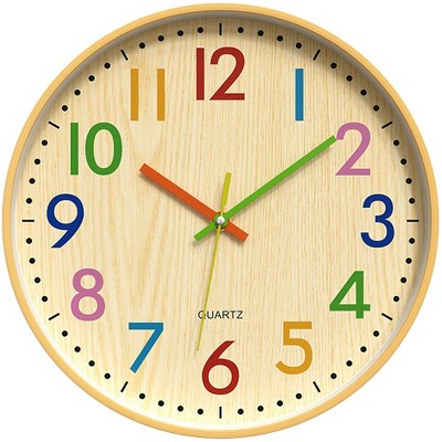 Designed with color numbers, this 12-inch wall clock adds a touch of warmth and elegance, making it suitable for classrooms, bedrooms, playrooms, and home learning spaces. The clock features a silent sweeping mechanism, eliminating ticking sounds and providing a quiet environment for studying, resting, or working. An excellent gift for teachers and anyone creating an educational or organized space, this clock stylishly supports time management.