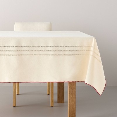 This soft and durable tablecloth is made of cotton linen. All liquids bead up for easy cleaning.
