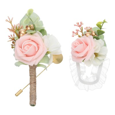 Unique Bargains Rhinestones Artificial Rose Bridesmaid Wrist Corsage and Boutonniere Set Champagne