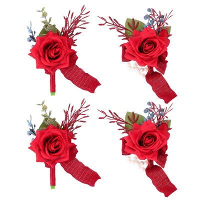 Unique Bargains Rose Corsage and Boutonnieres Set For Party Wedding Flowers Pin 2.76 Inch 2 Pcs Red