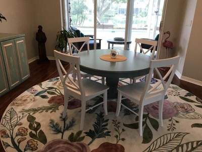 I bought this cheery rug for my dining room and I love it. It brightens up the room and looks great with blue table and white chairs. So glad I ordered it!