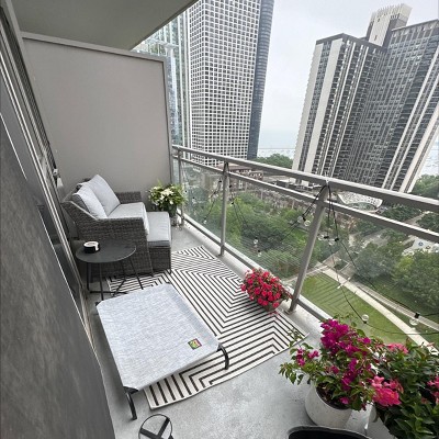 EASY CARE: For an outdoor rug, remove debris frequently with the use of a broom or blower. To wash, spray the surface with a soap and water mixture, then rinse thoroughly with a garden hose and hang over a railing to dry thoroughly. Rotate for even wear.