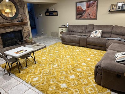 Guests appreciate the rug for its vibrant colors, quality, and cozy feel. It fits well in various spaces like solariums, kitchens, and bedrooms. While the rug is generally well-received for its appearance and thickness, some guests noted it isn't as soft as expected. The rug's pattern and initial smell were also mentioned but did not significantly detract from overall satisfaction.