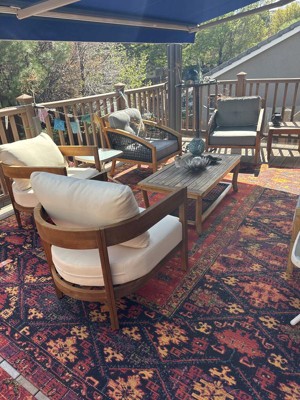 I purchased 4 of these beautiful rugs to Cover my entire slate patio. They are so colorful and great quality. I am over the moon excited to see my furniture sitting on top of these gorgeous rugs. I highly recommend purchasing rugs from this company. Best price and great quality.
