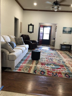 Great rug , beautiful colors. This rug makes a drab room come to life! Great price.