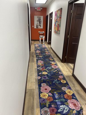 I’ve been looking for the right rug for our office for 5 years. I bought the rectangle one. And then immediately purchased the hall runner. We love them and are getting compliments from our tax clients (‘Tis the season for lots of clients to stop in). The hall picture doesn’t do the brightness justice. The orange wall is a brighter orange, not so brown. So take that into account. The rug is a bright blue with a small silvery stripe in it which from a distance makes it look lighter (kind of like a red and white stripe will look a little pink). It’s perfect for our us. And the price point was also perfect. Buy the rug pads too. They fit perfectly under each. No cutting necessary.