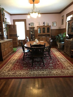 This rug is to be underneath the formal dining table made of dark sculpted wood. The rug is as described and the price is reasonable.
