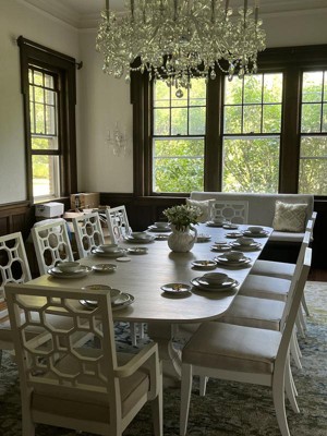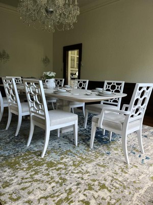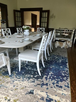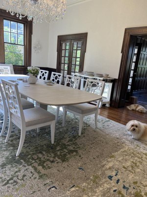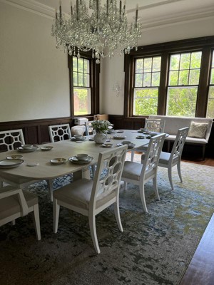 The Hyacinth Rug is just beautiful! I purchased the 10’ 6 x 16’ 5 size to fill our rather large and dark formal dining room in hopes of adding a contemporary flair to all the dark wood and wainscoting. The colors in the rug are light wheat, warm grey, cream, cilantro green and cerulean blue - a wonderful palette to play with when creating tablescapes! Be sure and purchase a rug pad to avoid wrinkles as the rug settles - took a week for buckles and wrinkles to relax. The rug is thin but great!
