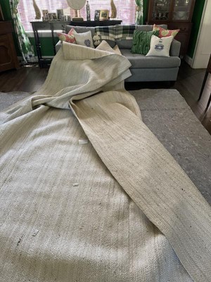 This rug is great and the perfect under rug for our expiation area rug. Be aware that the lines aren’t completely straight. We love it that way. Gives a more relaxed vibe!