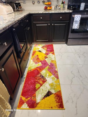 I bought the runner for our kitchen. The colors are multiple shades lighter then depicted and the edging is white, not blue as depicted. It's a lovely rug and even with the color changes we like it. I removed one star because the color was so much lighter then depicted and the edging is white and not blue as shown.