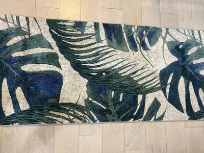The Blossom Runner Rug 2 x 8 is beautiful and bold. Soft aqua, delicious blue with a terrific feel of the tropics. Wonderful transition rug colors among living room furniture colors, floor colors, and the lanai furniture. Lovely accent leaves to carry thru a theme. Foing to get another for the kitchen. Highly Recommend.