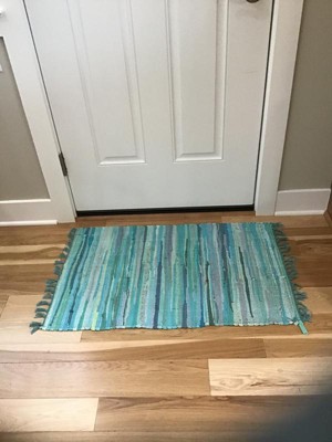 I have this rug in my front hallway. The colors are beach blues and greens. Thick enough that it doesn’t move all over the place