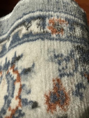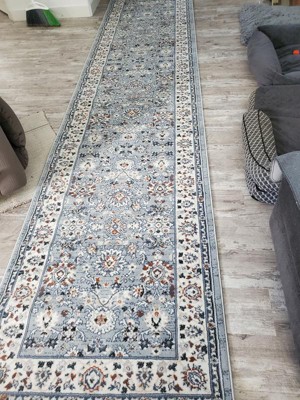 I liked that this rug came in the longer size and wider width than others. But it is what I call the old style of synthetic rugs, where it feels rough and cheap to touch, it’s thin and stays wrinkled a long time. I tried to get some close-up pictures that you can see what I mean. The Blue floral print is very pretty though when standing far back from it.