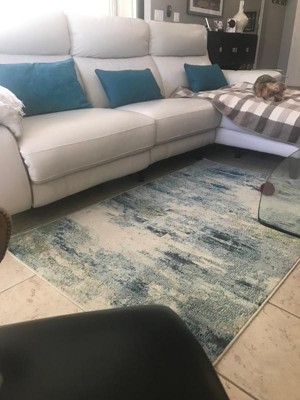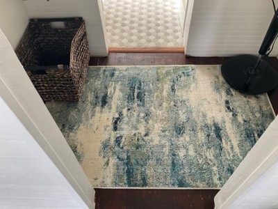 I recently remodeled my bathroom and wanted to find a rug that would both compliment and showcase the unique pattern in the tile. The tile is very “artsy” and has a sense of flowing in a sea of white. The blue in the rug accents the bluish colors on the til