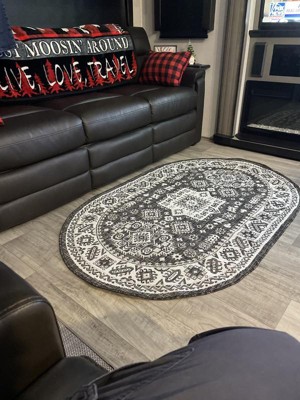 This is a great rug! Last fall (well, it was December) I purchased a larger rug for my front porch. and loved it so much, I ordered this oval rug. They are both great! I love the simplicity of this Aztec rug. My house is painted a very light silver/grey and the trim is dark charcoal, the rugs look so good and there are two five foot benches L shaped so it looks great with the rugs, the ends don't fly away because of the weight of the benches. I am so satisfied the way everything matches, and the color comes from three colorful planters surrounding the rugs. If it gets dirty, I squirt the rugs with the hose and it cleans right up, and the sun doesn't bother the rugs, they are bright, they are perfect.