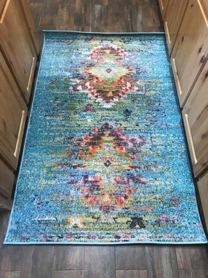 LOVE this rug!! I debated buyin because of other reviews about color is way off and not vibrant... but mine is EXACTLY as pictured (mine looks like it has more blue but it doesnt.. its just because i bought the smaller size around 3x5 i think) and even more vibrant than the companies actual photo! Im obsessed! curlin because i literally just unrolled it. Love it for my new kitchen rug!! Ps the darker spot on the left is because my island shades part of it from the light its not a mistake in the rug.