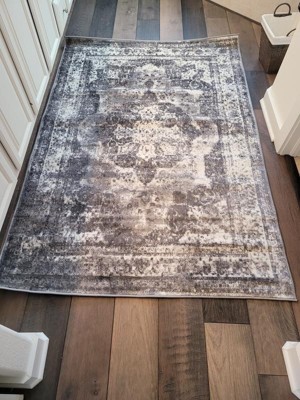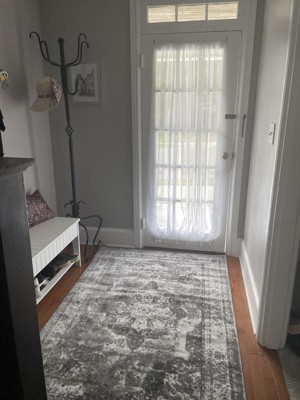 This is a beautiful rug, though it is a big thin. I used carpet tape to fasten it down in my front entry. The colors are a bit different from the way it looks on the screen---there is actually some taupe in the design. This meant that it didn't look good in the place I had ordered it for, but it looks beautiful inside my front door. The 4 x 6 size will be large enough for guests to leave their shoes if they choose to remove them.