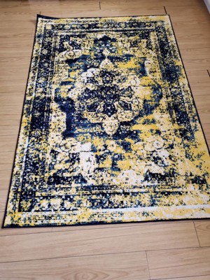 Great rug! I love the bright yellow combined with the navy, and it feels great under my feet. If you're considering it, make sure you look closely at the pattern; one corner is definitely more yellow than the rest. Also noticed several long threads hanging off the edges when I unrolled it. But all in all I'm very satisfied.