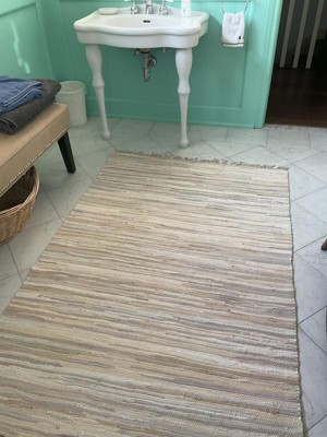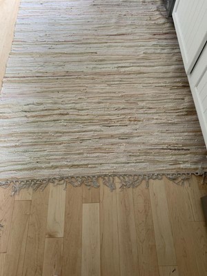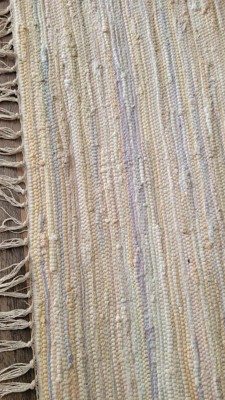 A beautiful, well made Chindi rug! I love the other color variations within the rug woven within! I also love the fact that it is cotton and can be washed if needed. There is no rubber backing to it. It brightens up my wooden floors and ties in well with my other colors in the home. Definitely getting a couple more of these! A great deal!