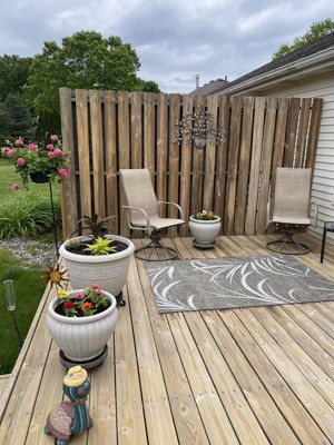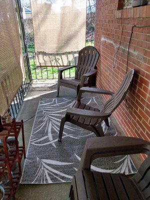 I like the design and the texture of the material of the patio rug. It is a little more grey in color than the photo. I really can’t tell yet how this rug will weather a season or two in my deck. I have already had compliments.