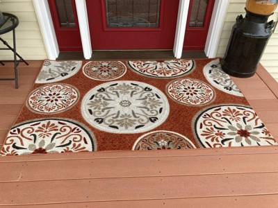 • CARE: For an outdoor rug, remove debris frequently with the use of a broom or blower. To wash, spray the surface with a soap and water mixture, then rinse thoroughly with a garden hose and hang over a railing to dry thoroughly. Rotate for even wear.