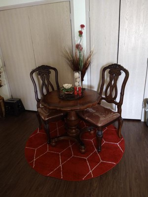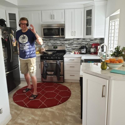 I thought 5ft x 5ft wouldn’t be enough but I’d figured I’d try. This was the only rug I’ve found that was a true deep red, not burgundy or bright red, that matched my kitchen/dining room perfectly! Without this rug the kitchen was boring, with it, it’s complete!